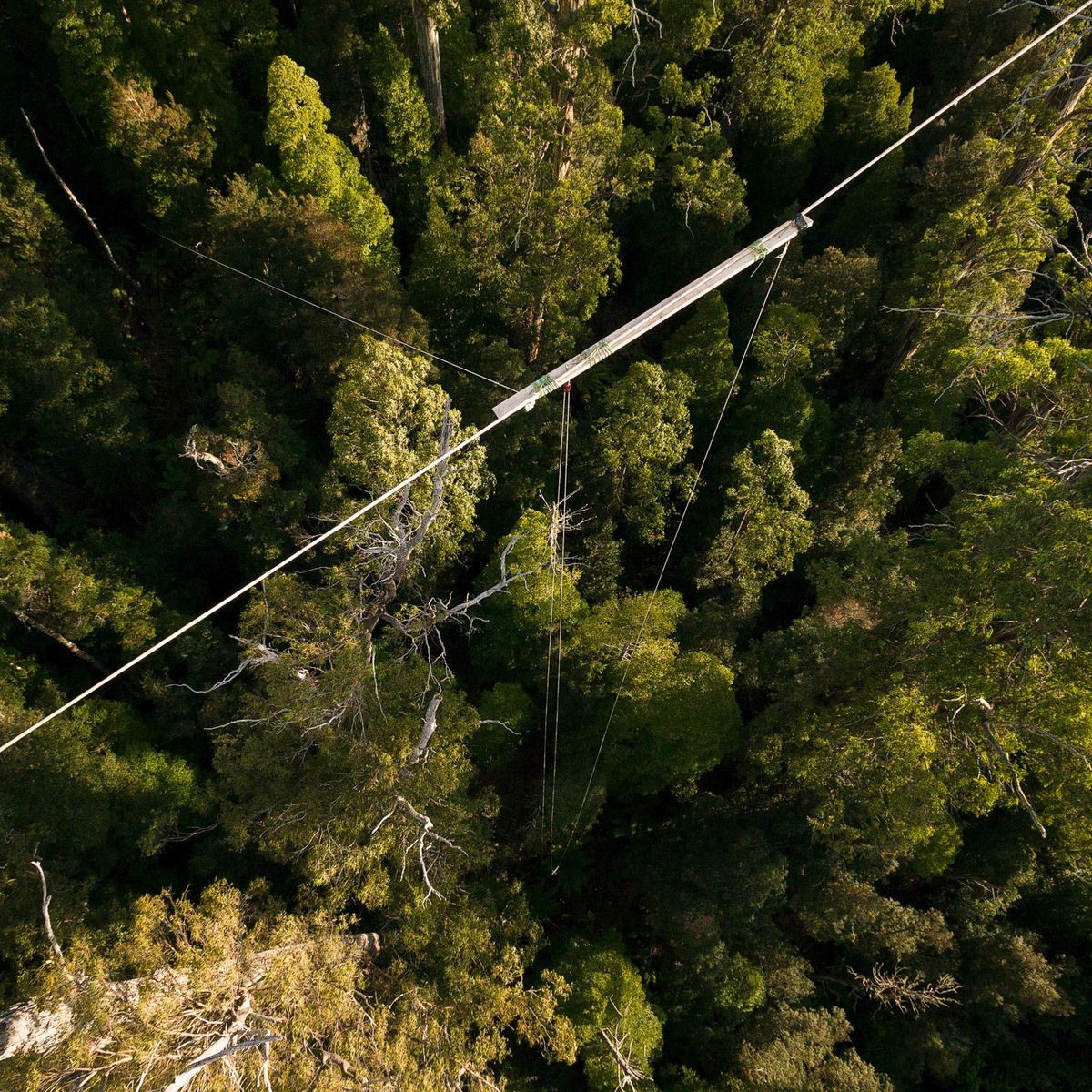 In einem ähnlichen Projekt in Neuseeland, mit einem 41 Meter hohen Baum, sammelte die Mannschaft Praxiserfahrung. Die doppelte Größe des Rieseneukalyptus stellte sie jedoch vor neue Probleme. Auch wenn das Team für seine Aufnahmen lediglich eine freie Sichtsachse von wenigen Metern benötigt, ist die Suche nach dem perfekten Baum nicht einfach. Zwar stehen im dichten Dschungel Tasmanien viele Eukalypten, aber drunter auch dichtgedrängt unendlich viele „kleine“ Bäume.