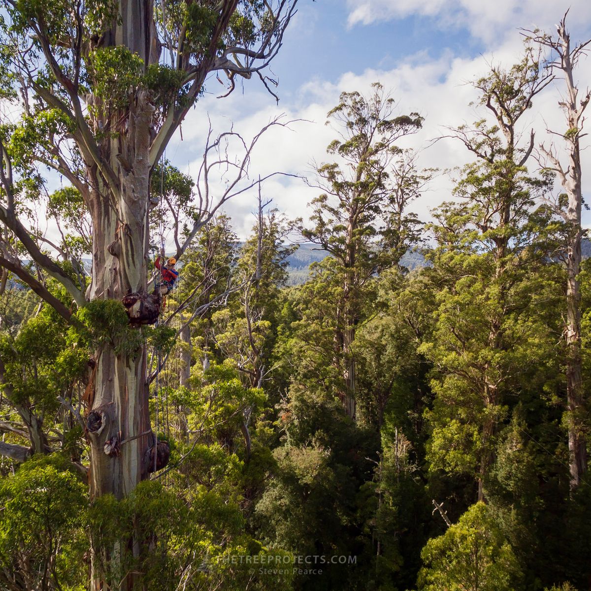 Als weiteres Problem benötigten Steven Pearce und seine Mitarbeiter noch einen zweiten Eukalyptus in der Nähe als Satellitenbaum. Denn zwischen den beiden muss ein Seil gespannt werden, an dem der Fotoaufzug installiert wird. Am Ende fiel die Wahl für das Tasmanian Tree Projekt auf Gandalf’s Staff. 87 Meter hoch und ein Orientierungspunkt auf dem Tolkien Track. Der Baum lässt sich gut klettern und gerade einmal 60 Meter entfernt steht ein ähnlich großer Eukalyptus. Dessen Krone besteht zwar aus zwei Stämmen, lässt sich aber über seine Hauptachse ebenfalls gut klettern.