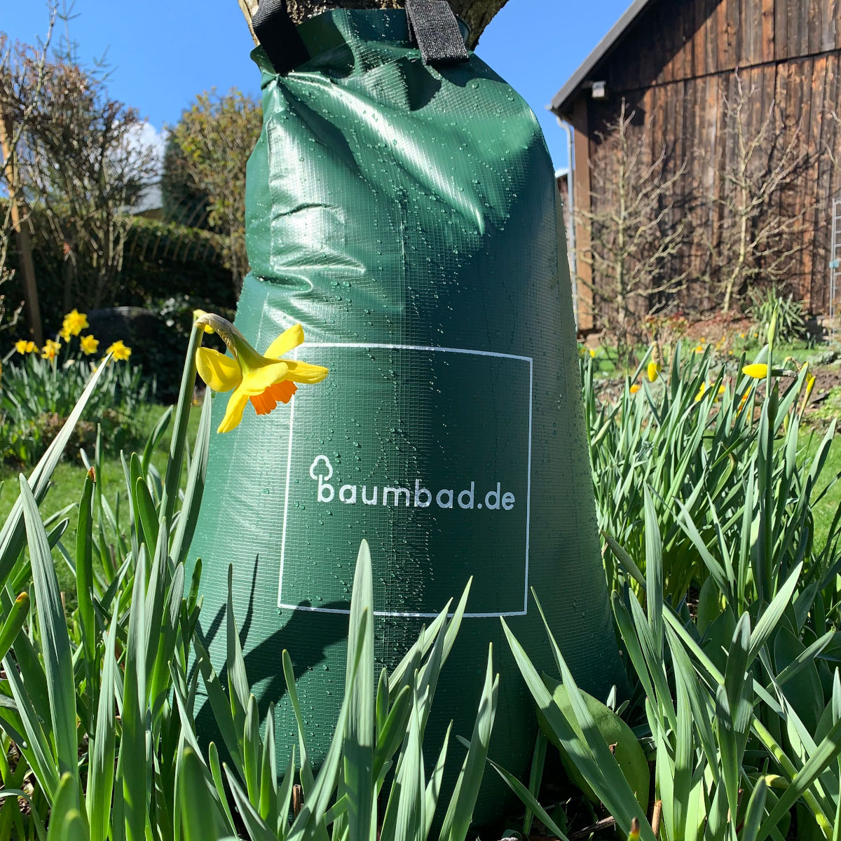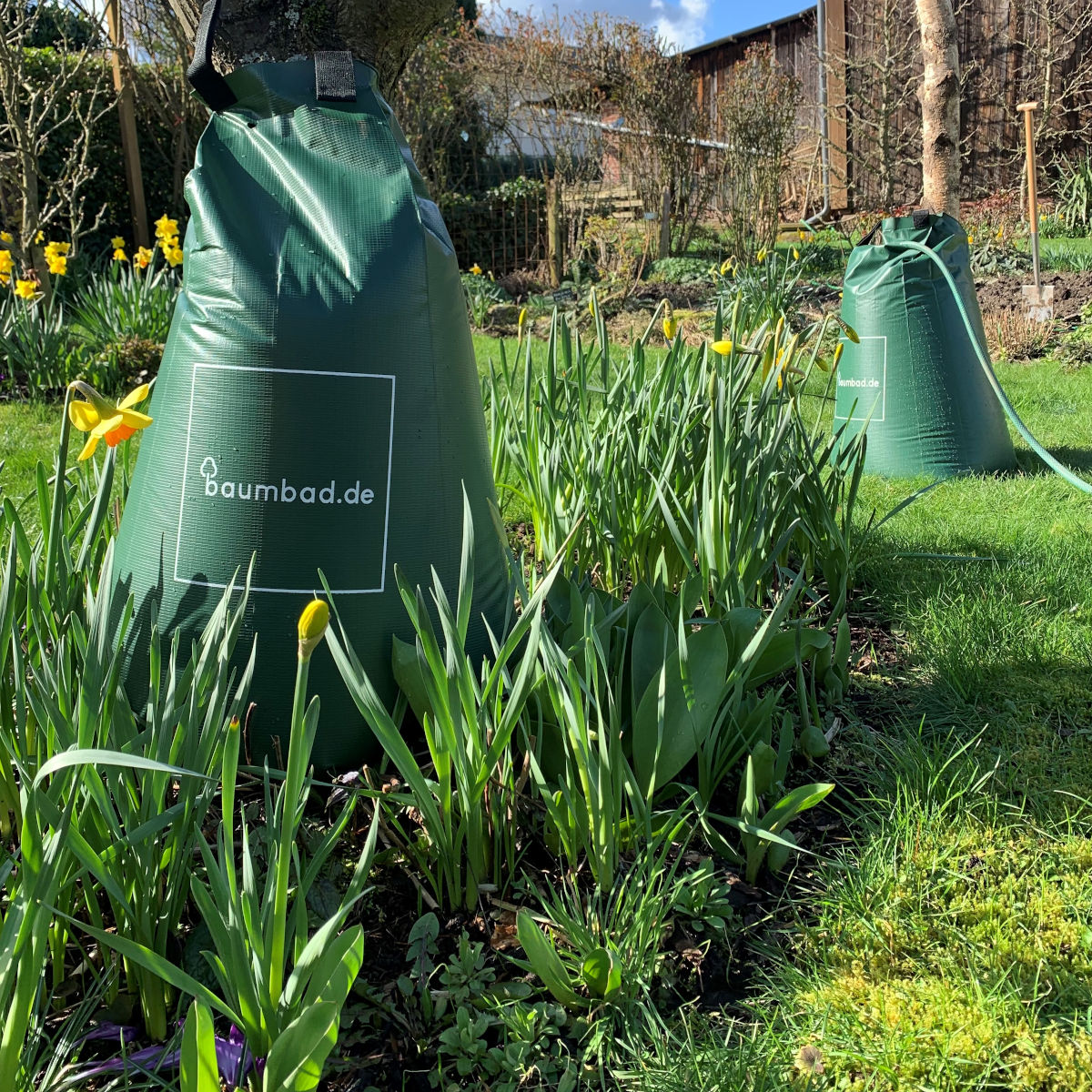 Würde man mit einer Gießkanne wässern, fließt das meiste Wasser gleich wieder weg, ohne dass es in die tieferen Schichten kommt und der Baum bekäme nicht viel davon ab. Hilfreich sind Baumbewässerungsbeutel besonders dann, wenn der Boden bereits trocken ist. Ein trockener Boden kann Wasser nur sehr beschränkt aufnehmen. Wichtig für die Baumpflege im Frühling ist, dass der Wasserbedarf von Bäumen sehr unterschiedlich ist. Einige Bäume – besonders ältere Bäume mit tiefer Verwurzelung – kommen im Frühling ohne zusätzliche Bewässerung aus.