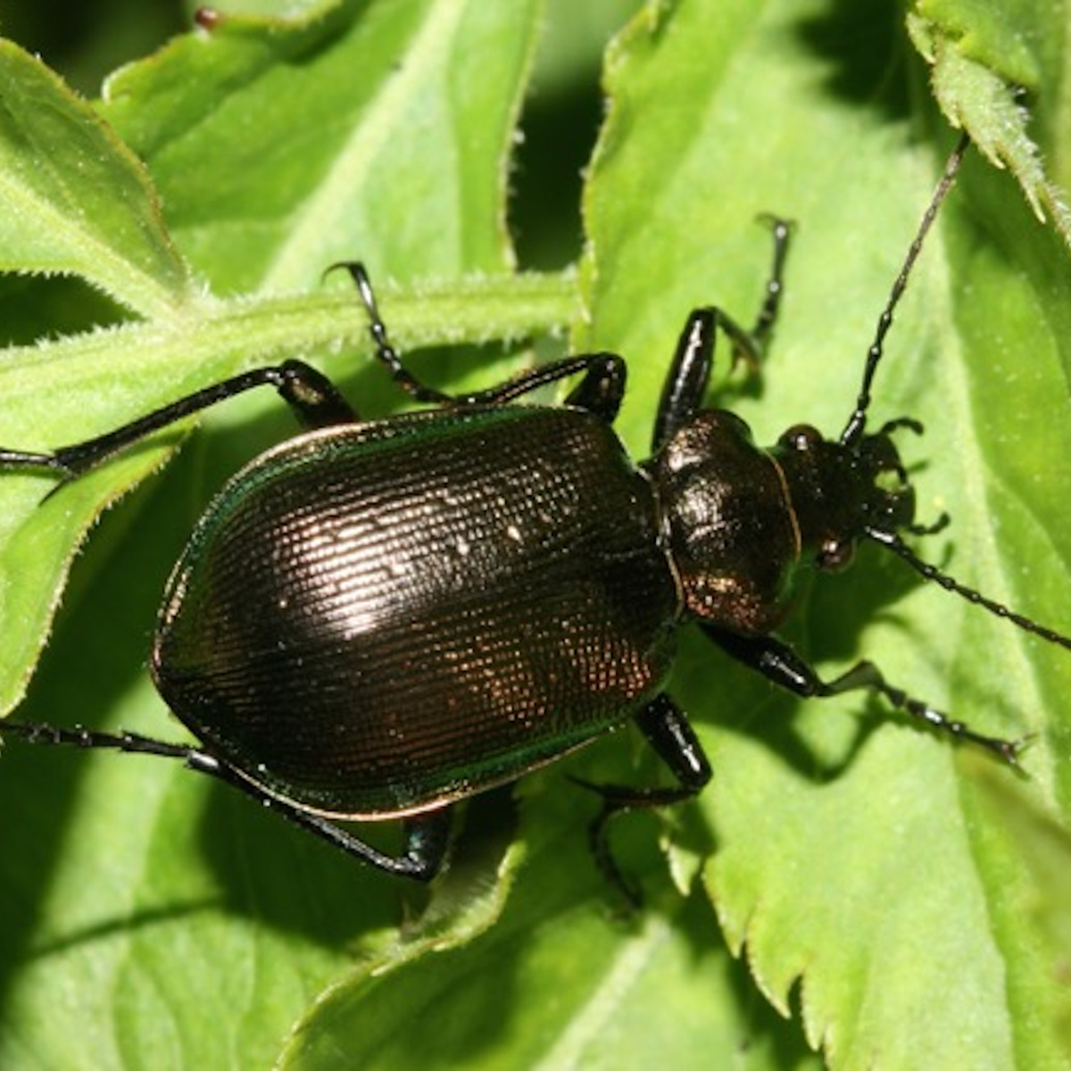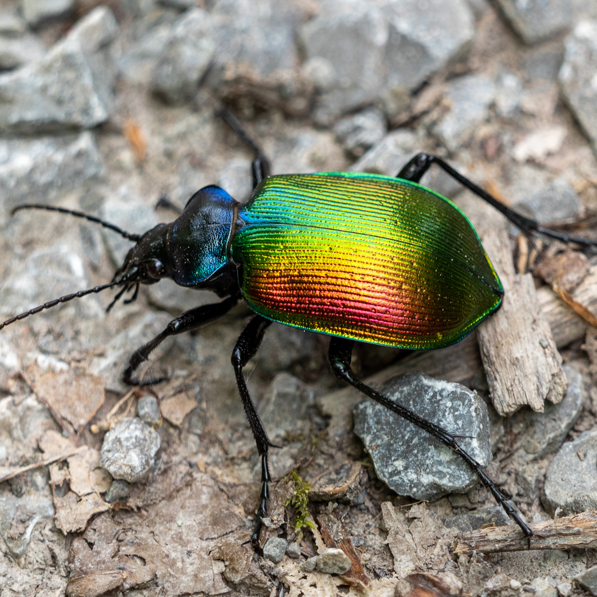 Wenn Schwammspinner oder Eichen-Prozessionsspinner sich stark vermehren, treten meist auch ihre Gegenspieler in Erscheinung. Zu diesen gehören Großer und Kleiner Puppenräuber, die beide die Stämme von Eichen erklimmen, um dort im Laufe ihres Lebens 300 bis 400 Raupen und Puppen zu verspeisen. Beide sind daher sehr nützlich, gelten aber als selten und gefährdet. Die LWF erforscht das Vorkommen beider Arten und bittet um Meldung von Sichtungen, mit Datum, Koordinate und Bild, an Puppenraeuber@lwf.bayern.de. Meist wird man die tagaktiven Tiere im Mai bis Juli zu Gesicht bekommen. Eine Bestimmungshilfe und weitere Informationen finden Sie auf der Seite der LWF. Wichtiges Merkmal: die messerscharfen Kauwerkzeuge und das querovale Halsschild ist allen Puppenräubern gemeinsam. Die Große ist goldmetallisch mit blauem Halsschild, der Kleine kupferfarben.