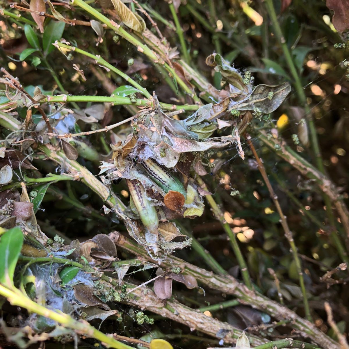 Der wohl bekannteste Schädling am Buchsbaum ist sicherlich der Buchsbaumzünsler. Die Raupen des Schmetterlings fressen meistens erst auf der Sonnenseite im Inneren der Pflanze und werden daher erst spät entdeckt. Bis zu 45 Blätter frisst eine Raupe in ihrer Entwicklung. Nach den Blättern nagen sie die Rinde und Triebe des Buchsbaumes an. Das führt dazu, dass die Triebe absterben. Befallene Pflanzen sind vom Gespinst überzogen und teilweise eingetrocknet. Es gibt noch keinen Buchsbaum, der resistent gegen den Buchsbaumzünsler ist. Allerdings gibt es einige Ilex-Sorten, die dem Buchsbaum ähnlich sind und die dieser Schädling nicht befällt.