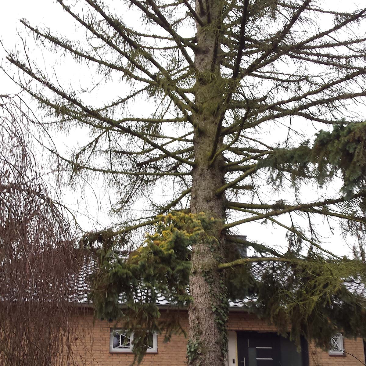 Bei meiner sterbenden Fichte wurde 2020 ein Pflegeschnitt durchgeführt. Zusätzlich wurde die Krone des etwa zwanzig Meter hohen Baumes gekürzt. Bis dahin war der Baum noch grün. Ein paar Monate später wurden die Nadeln von oben nach unten braun und fielen ab. Lediglich die unteren Äste haben jetzt noch grüne Nadeln.
