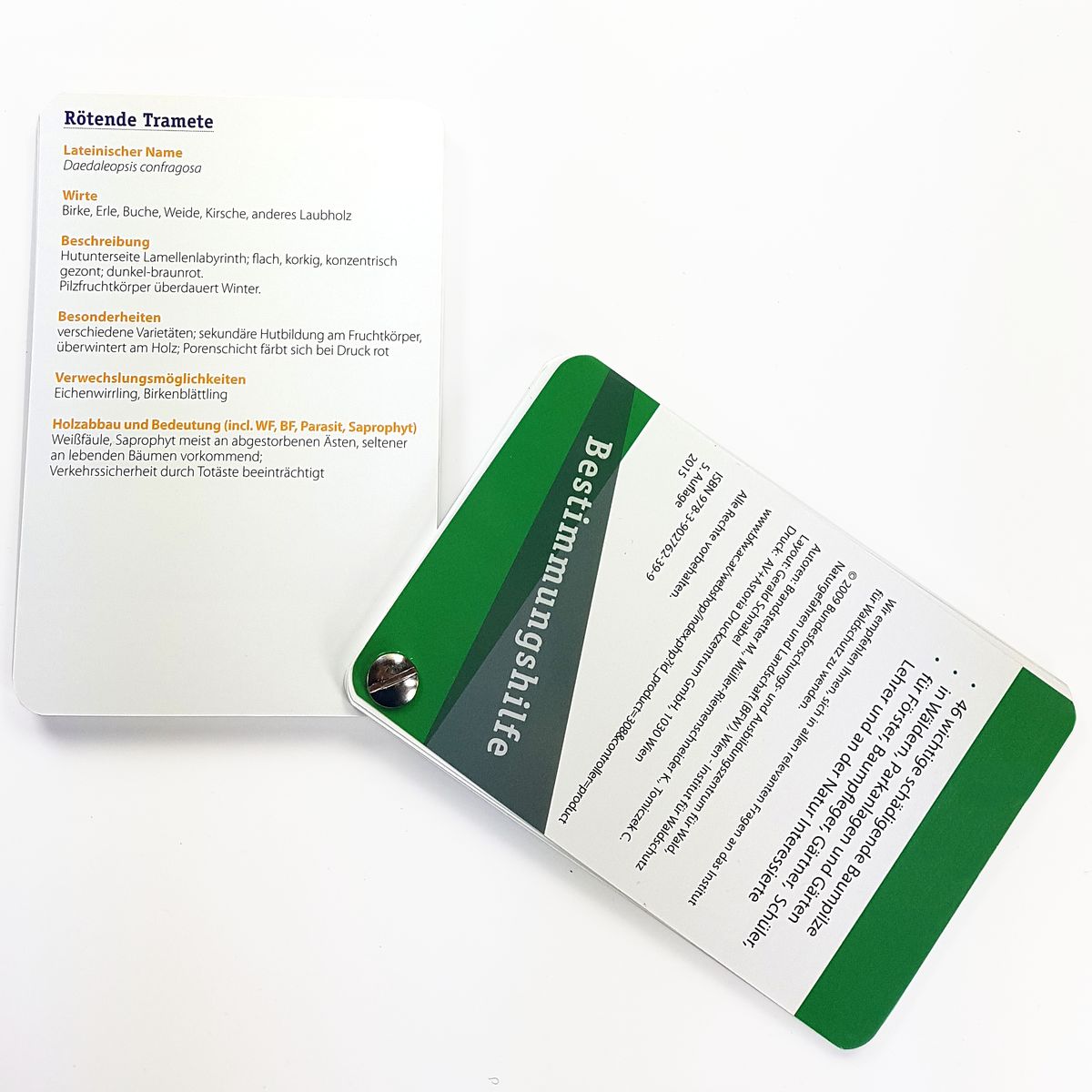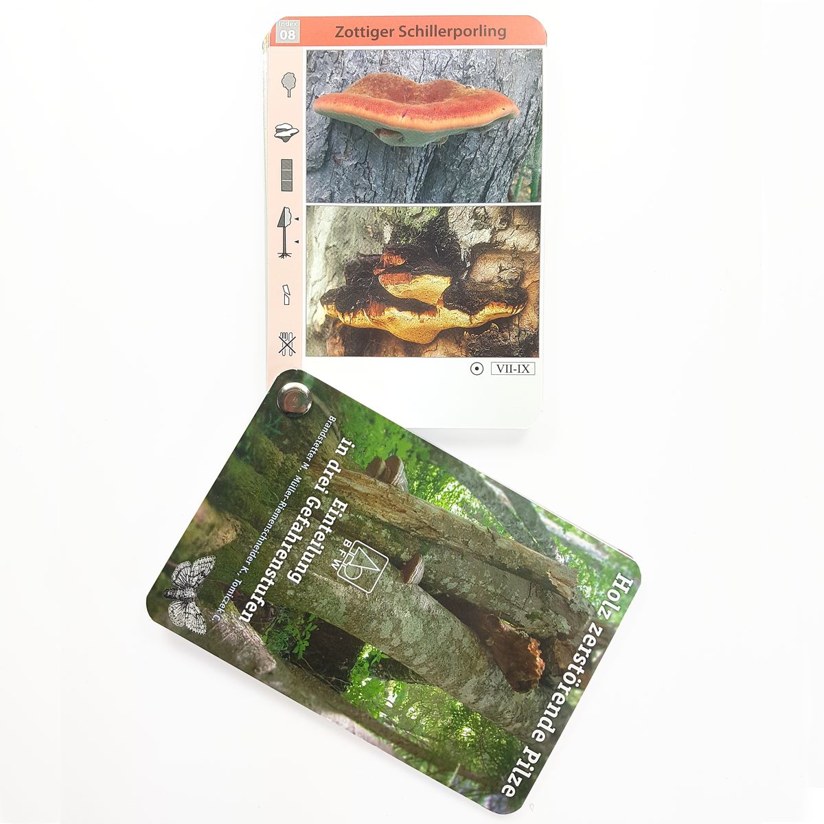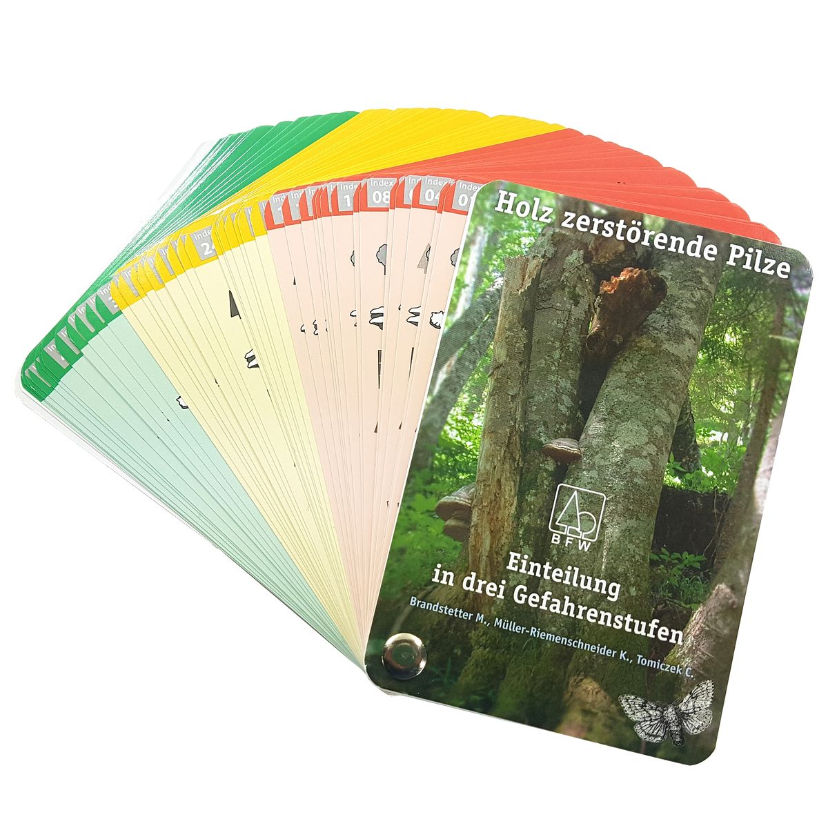 Der Pilzfächer enthält 46 schädigende Baumpilze im Wald, in Parkanlagen und in Gärten. Eingeteilt in drei Gefahrenstufen bekommt jede Pilzart ein Fächerblatt. Neben Fotos und allgemeinen Infos zu Häufigkeit, Aussehen, Auftreten am Baum, Form der Fäule und Essbarkeit, stehen auf der Kartenrückseite genaue Angaben zu den Wirten, Beschreibungen und Besonderheiten der Pilze sowie Verwechslungsmöglichkeiten.