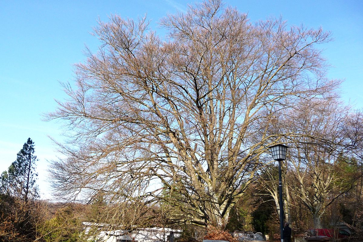 Mit dem carakteristischen Habitus einer „Hutebuche“. Der Baum hat eine kurze Stammbasis cica 1,8 Metern und weit ausladende Äste, die teilweise schon bis auf den Boden reichen. Der Kronenaufbau ist durch vier starke Haupt‐Stämme geprägt. Desweiteren weist er noch eine Reihe von sehr langen, waagrecht verlaufenden Starkästen im unteren Kronenbereich auf.