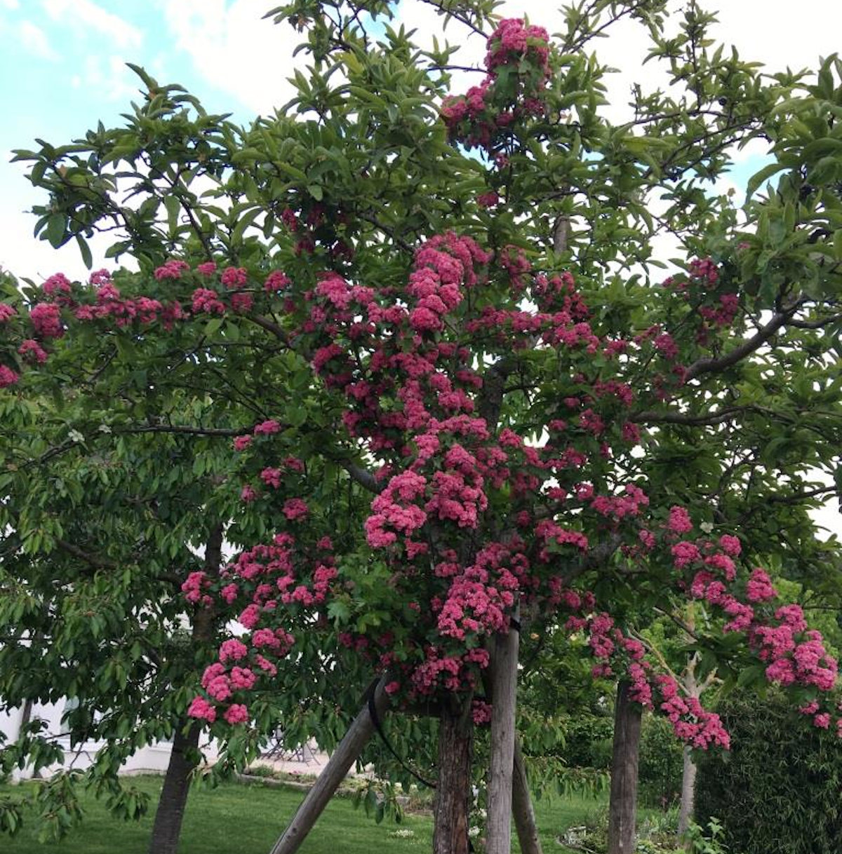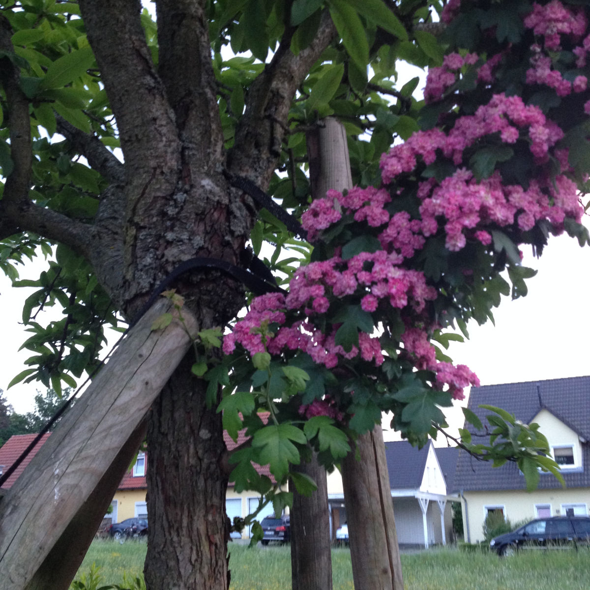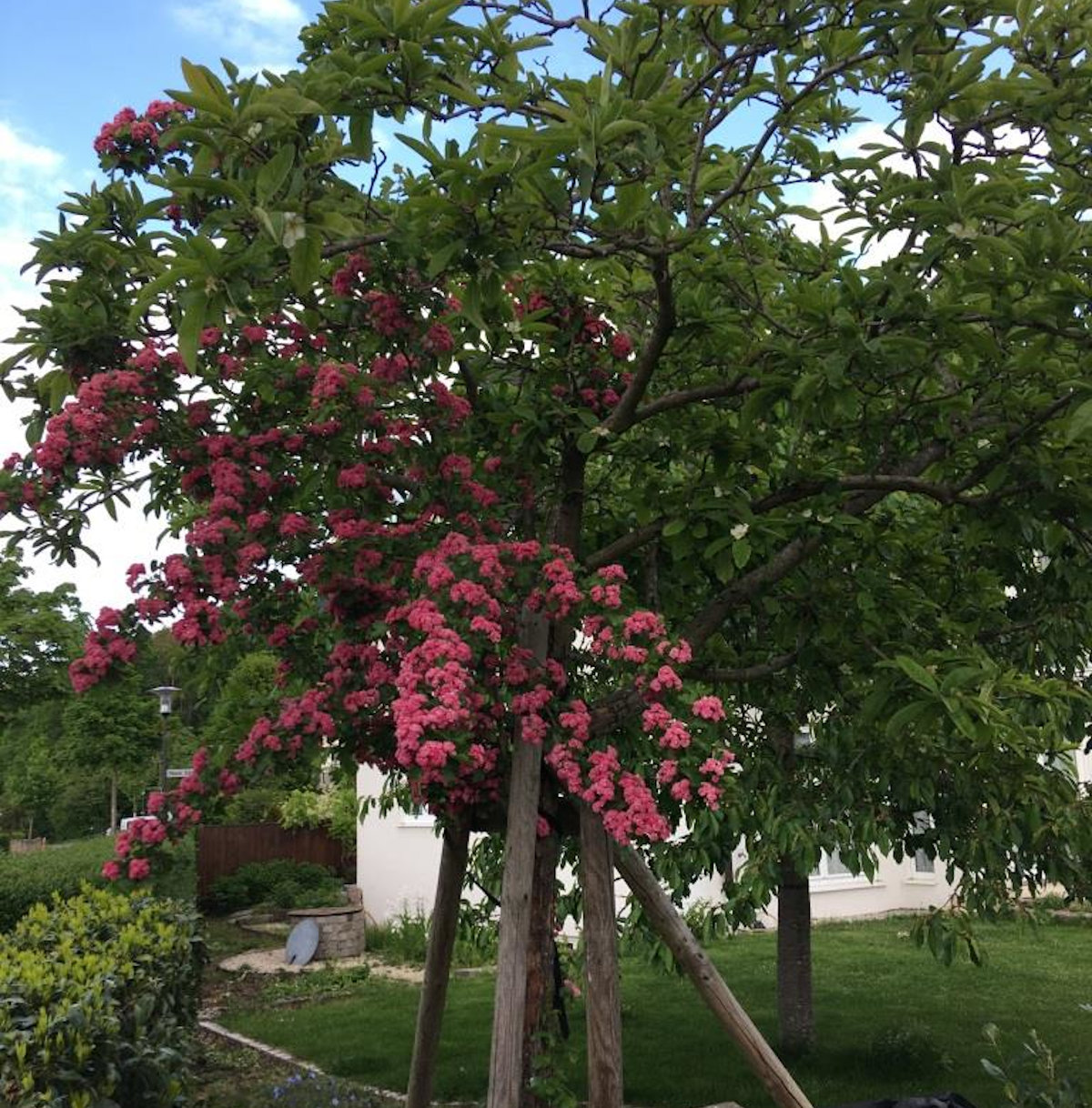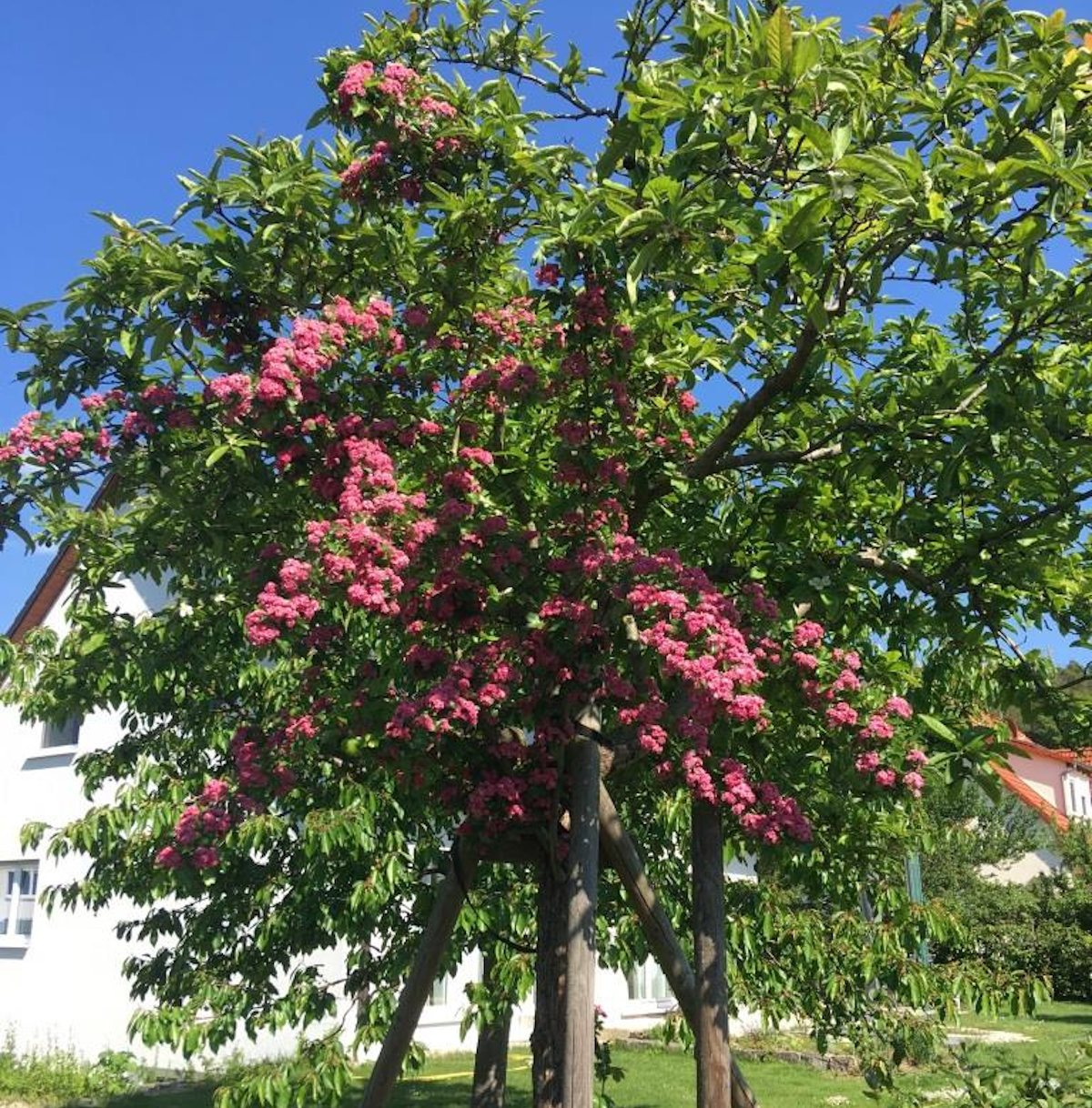 Kaum sind zwei Jahre vergangen, sieht der Mispel Hochstamm gänzlich verändert aus. Aus dem ursprünglich einzigen „fremden Ast“ hat sich eine kleine Blütenkrone entwickelt. Zahlreiche Rotdornäste wachsen in die Krone und machen den Eindruck des sonderbaren Doppelbaumes perfekt. Rosa Blütenpracht im Frühjahr und Fruchtwunder aus Mispeln im Herbst – eine ideale Kombination für den Garten.