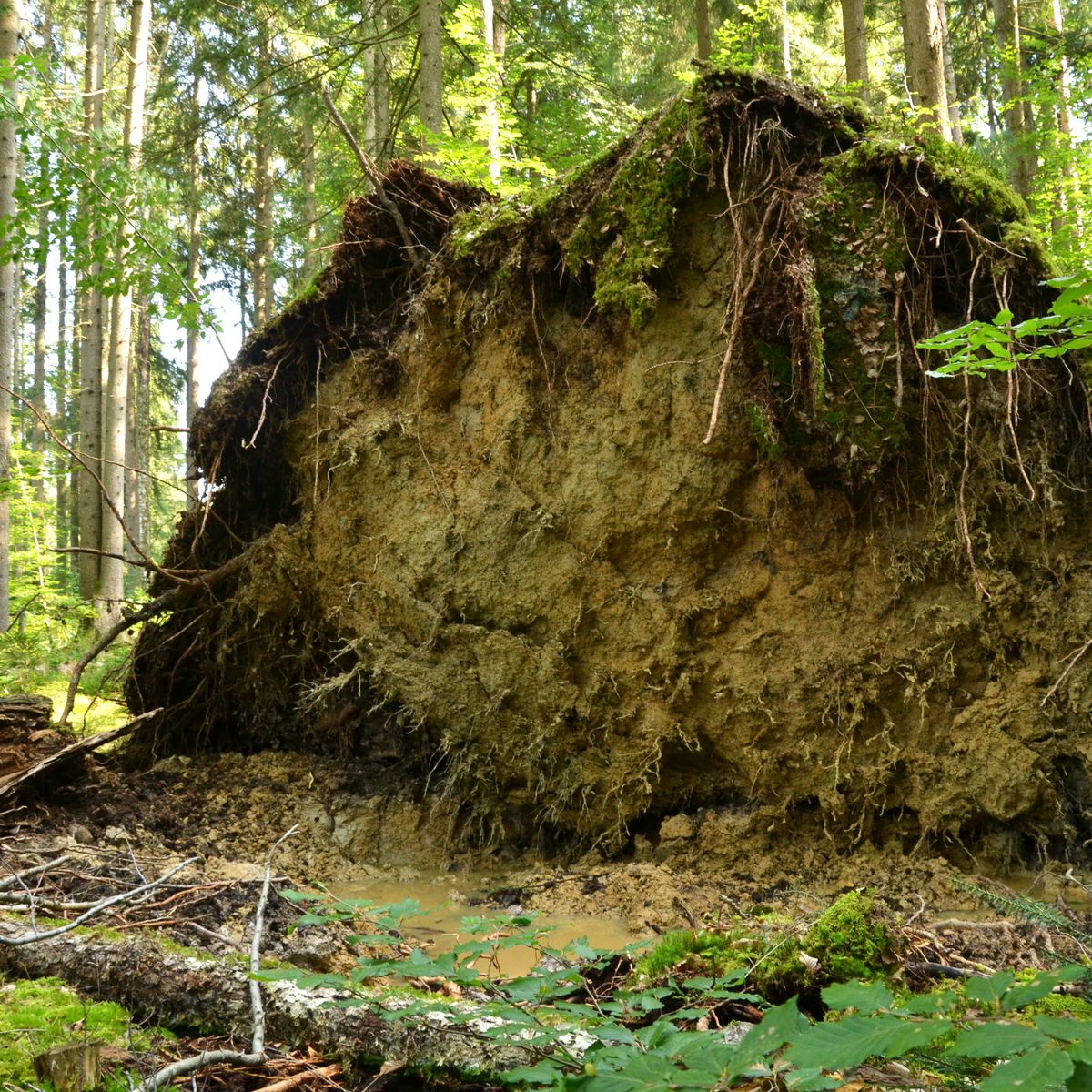 Bäume kippen nicht einfach um, da sie sich mit ihren Wurzeln im Boden verankern. Der oberirdische Baumteil aus Stamm und Krone wirkt wie ein Hebel auf die Wurzelmasse. Senkrechte Wurzeln verhindern, dass der Stamm kippt; waagerechte Wurzeln sind wie Zugseile und schützen bei starken Winden. Die Fichte bildet ein Senkerwurzelsystem mit oberflächennahen Starkwurzeln aus, von denen senkrechte Senkerwurzeln in die Tiefe gehen. Es fehlt somit oft eine stabile Hauptwurzel, die den Baum als Stammverlängerung im Boden verankert.
