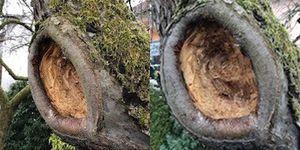 Auf meinem Grundstück stehen zwei alte Apfelbäume. An einem Baum ist eine alte Schnittstelle mittlerweile stark gefault. Das Holz in diesem Bereich ist matschig und leicht zu entfernen. Die Wunde ist sehr groß und der etwa 30 cm dicke Ast lässt sich mindesten zur Hälfte aushöhlen.