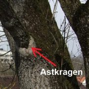 So leicht das Entfernen von Totholz eigentlich ist, man kann trotzdem auch hier Fehler machen. Der Schnitt sollte kurz vor dem Astkragen (siehe rechts) angesetzt werden. Es sollte nur das Gewebe des toten Astes abgeschnitten werden, auf keinen Fall das des gesundes Astes oder Stammes!