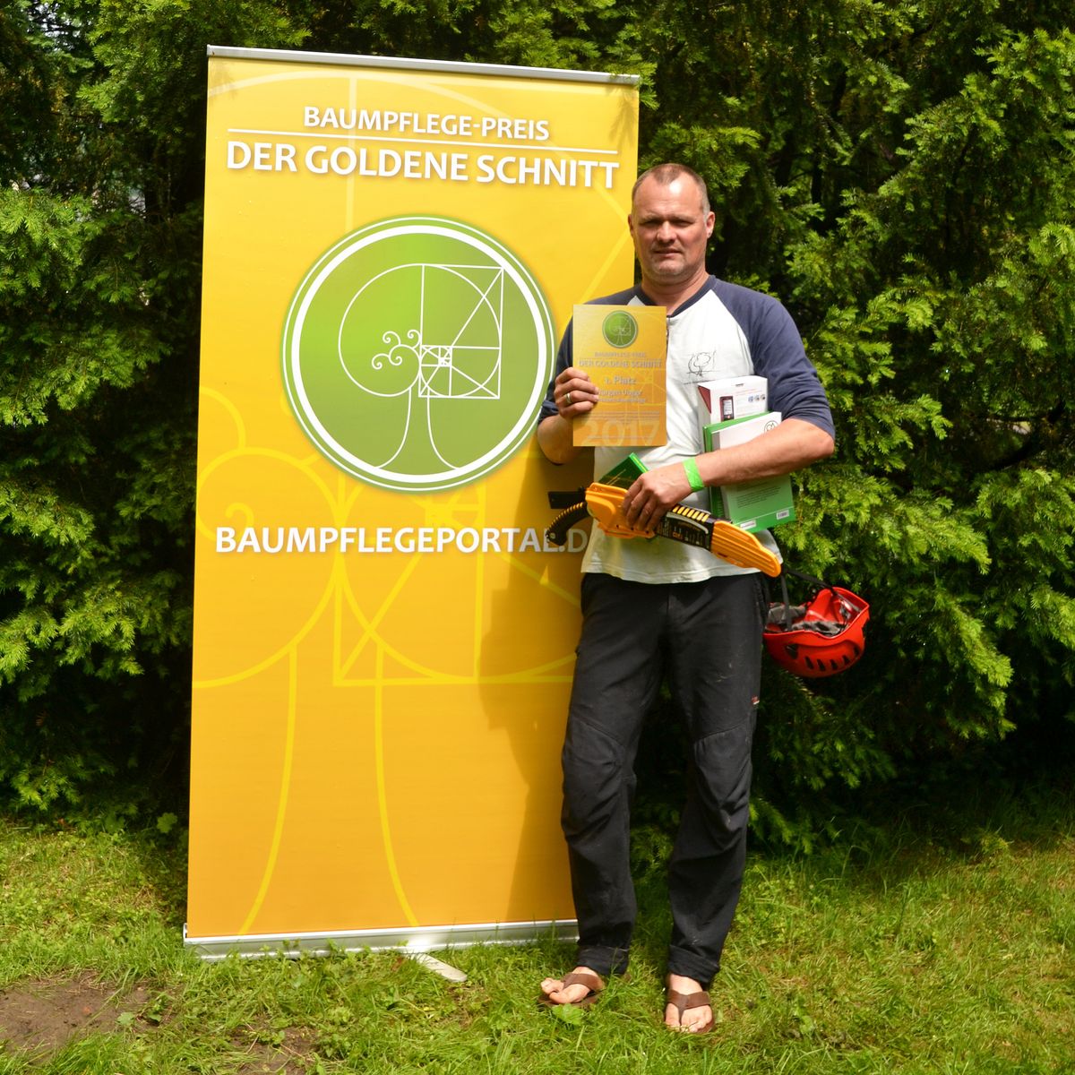 Auf den ersten Platz wählte die praxiserfahrene Fachjury für den Goldenen Schnitt 2017 Jürgen Unger und sein Unternehmen Eichhorn Baumpflege. Die eingereichte Maßnahme zeigt geradezu exemplarisch, wie fachgerechte und sinnvolle Baumpflege durchgeführt und gleichzeitig die Öffentlichkeit sensibilisiert wird. Angetrieben von der unnötigen Kappung von 15 Linden in Buer, übernahm Jürgen Unger die Patenschaft über drei Linden, um diesen das gleiche Schicksal zu ersparen. Zehn Jahre lang wird er mit seinem Team die Linden pflegen. Über den Lauf der Zeit wird damit der Unterschied in den Auswirkungen guter Baumpflege und der Kappung der gegenüber stehenden Linden sichtbar. Bereits jetzt begleitet die örtliche Presse das Wirken von Jürgen Unger in Buer mit großem Interesse.
