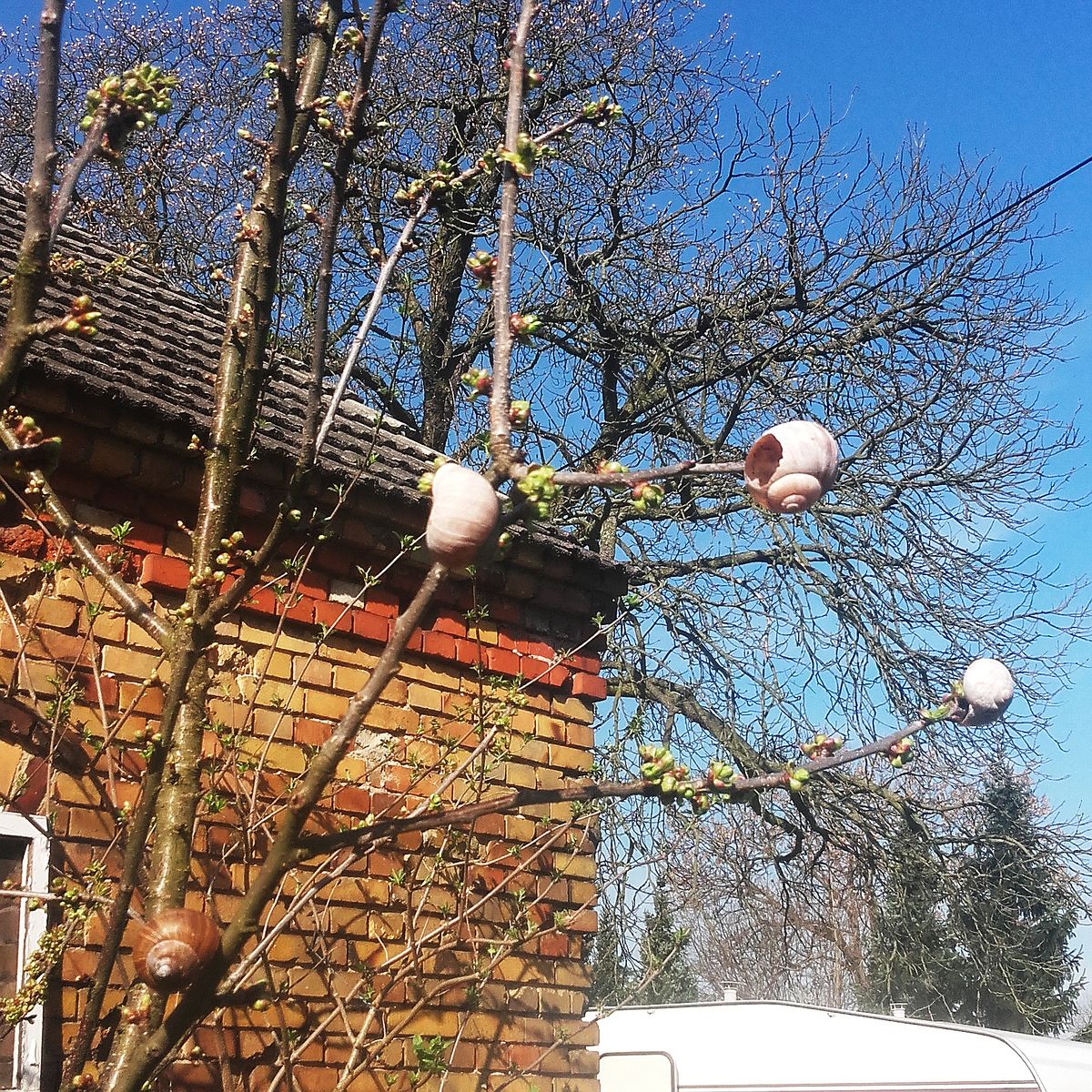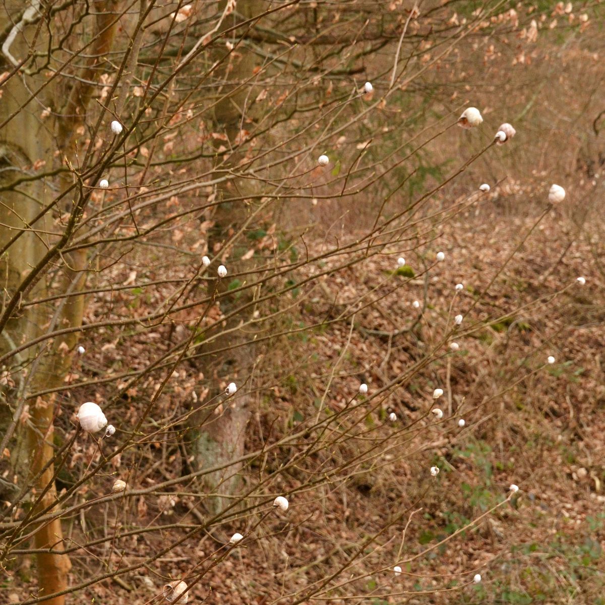 Die Wissentschaftler des Johannes-Bilharz-Institutes für Baumpflege und Baumklettern führten im Altmühltal bei Kelheim Routine-Aufnahme durch, als ihnen in einem abgelegenen Waldstück ein mysteriöser Baum auffiel. Aus der Ferne deutete zunächst alles auf einen Baum aus der Gattung der Schneebeeren (Symphoricarpos) hin. Jedoch wären die weißen Knuppeln an den Zweigen viel zu groß gewesen. Bei näherer Betrachtung erwiesen sich die Früchte als steinhart, mit einer Form, die stark an ein Schneckengehäuse erinnert. Diese „Schneckenfrüchte“ sitzen völlig untypisch vereinzelt am Ende der Triebe.